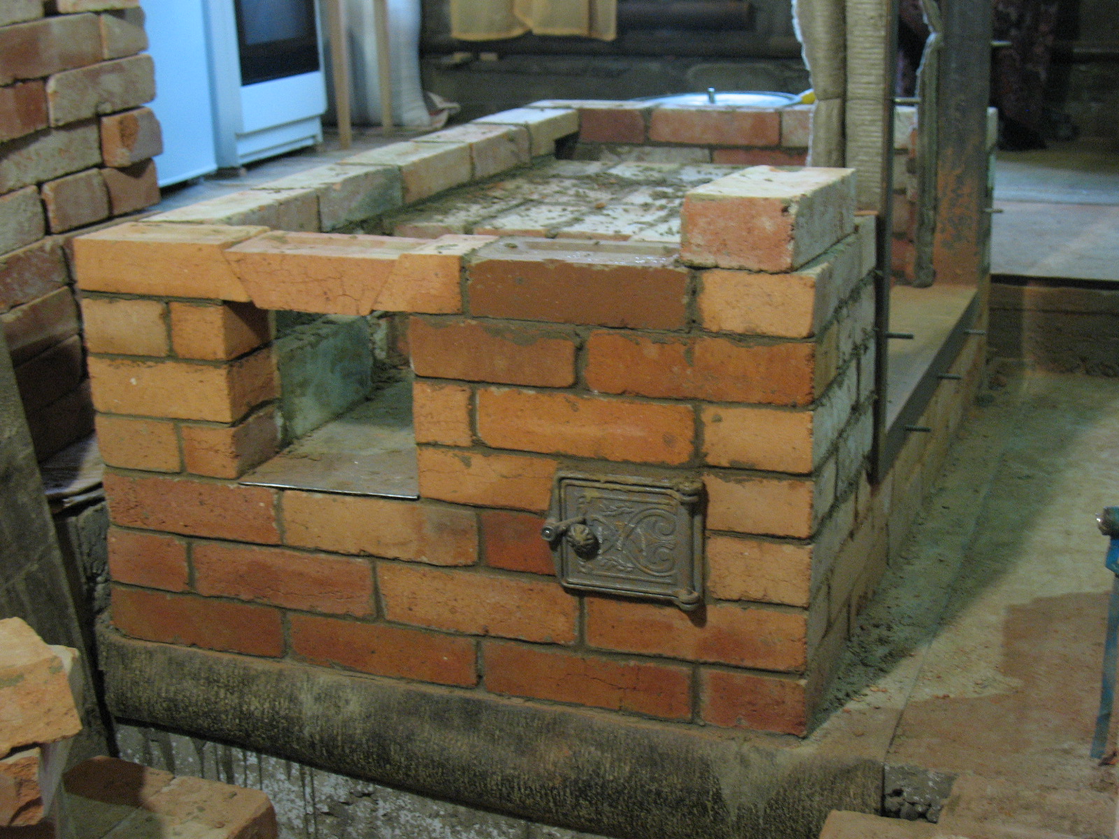 Сама печь - по мотивам КИКсП 16, ОВИК 20. Удалось найти прекрасный "сталинский" кирпич. При сушке проем просто закрыл листом жести с базальтокартоном, пока котел доделывал.