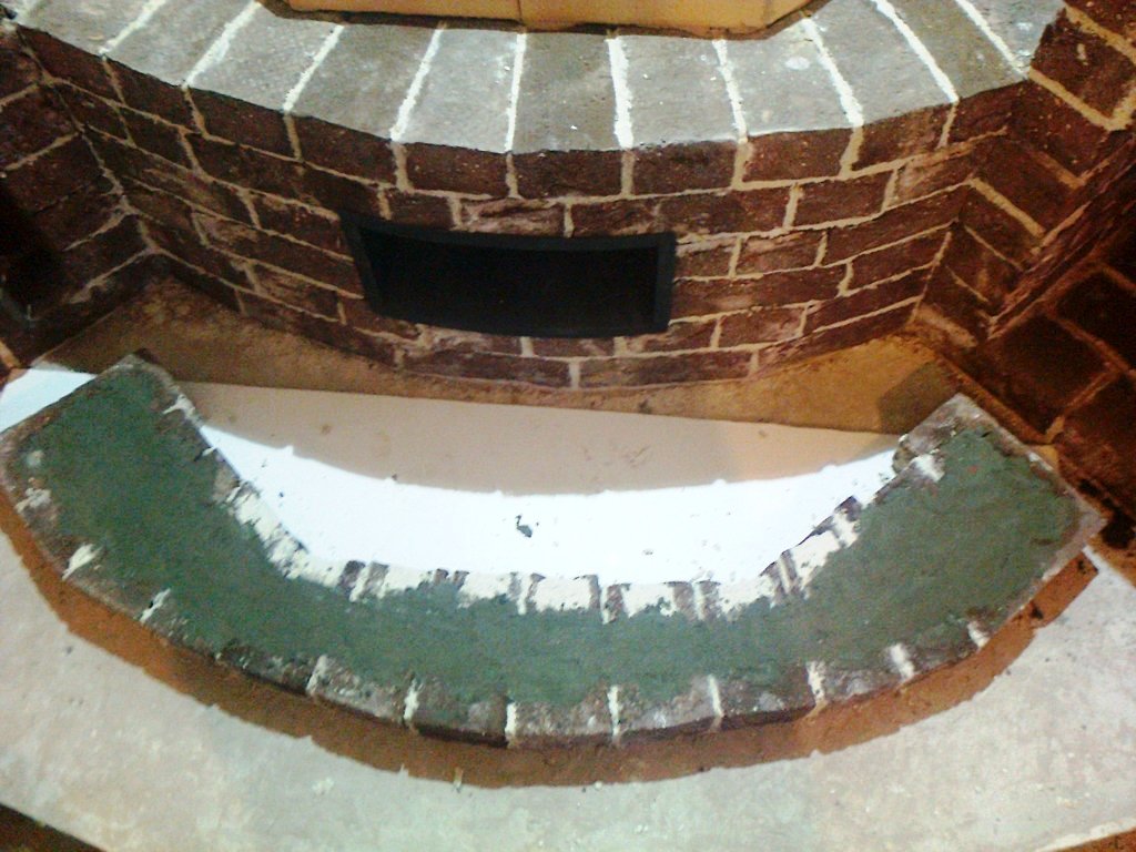 Разложили радиусом кирпичи. Сделали в середине каждого выемку с обратным "зубом". проармировали арматурой и залили составом : 1 часть глинозёмистого цемента, 3 части песка. По раме эркерной дверки вырезали ША-8. Скрепили между собой на шпильке + Витонит ТМ . Получились две балочки, одна внутри, другая наружный декор.