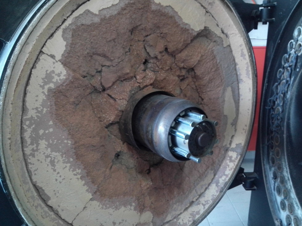 Есть два итальянских водогрейных котла по 2 Гкал/ч каждый. Один из них работал один сезон на дизтопливе, пока не подвели газ. Результат работы на фото. Из-за того, что дизельная горелка была где то половины мощности котла, сопло горелки вызодило гораздо меньше от футеровки, чем это видно на фотографии (на фото - газовая горелка). И сопло у дизельной горелки было меньше в диаметре миллиметров на 100. В результате работы нагрелась передняя крышка, ее повело и она поломала футеровку. Состав футеровки можно рассмотреть на втором фото.