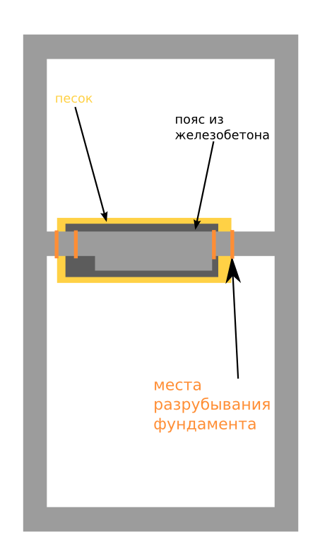 1)разбивать перфоратором фундамент (отвязывать его от фундамента дома), поскольку стены там кирпичной все равно уже не будет. (будет перегородка из гипсокартона в пол метрах оттуда стоять)