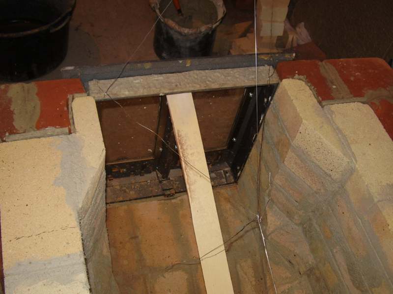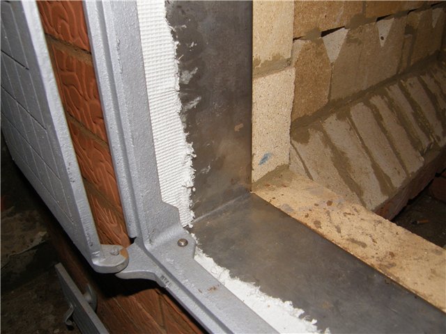 | Сверху огнеупор прикрыл опять же вплоть до чугуна. Дополнительное крепление дверцы нержавейкой, используя дырочки сверху. |