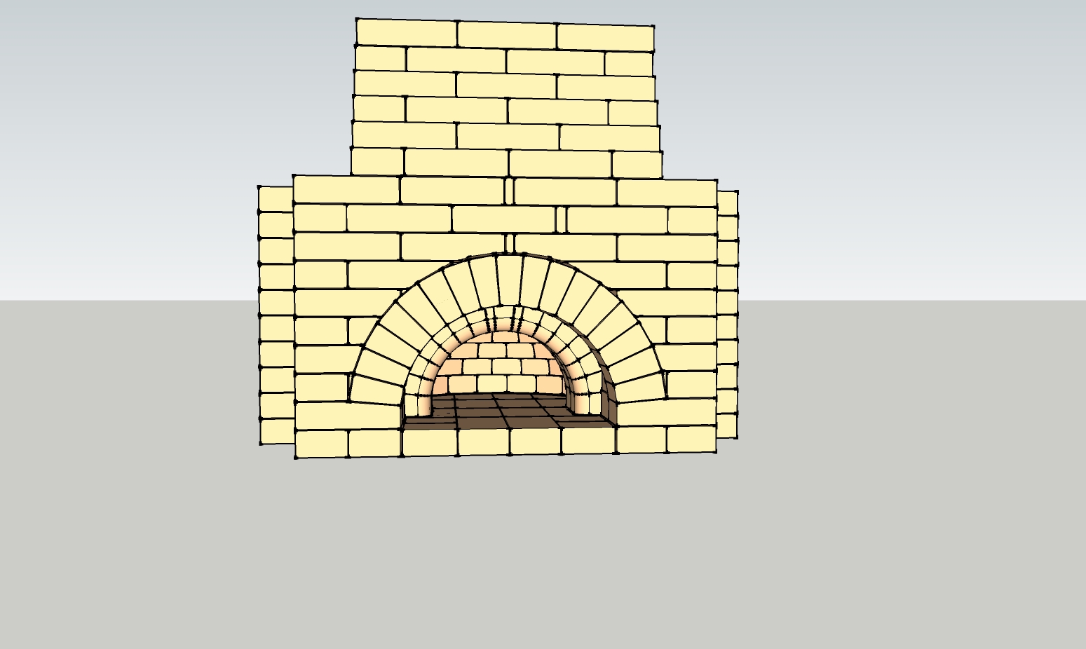 Как мне кажется решил геникологическую проблему. Поставил трубу на арку над куполом. смотрится менее эстетично, но без геникологии. Но прочность купола толщиной 60 мм вызывет сомнения, даже с учетом того что подовые кирпичи лежат с зазором 5мм от внутренней стенки купола и арок, купол и арки будут стянуты металлом. Вот что получилось. Дымить явно не должно ни в режиме помпейки, ни в режиме мангала.