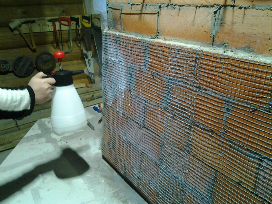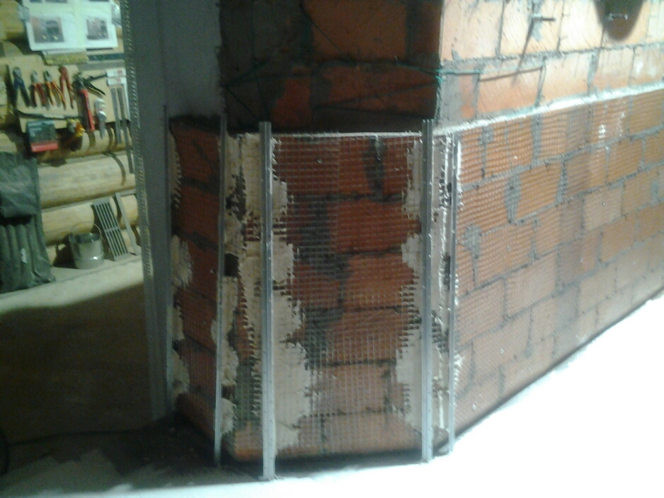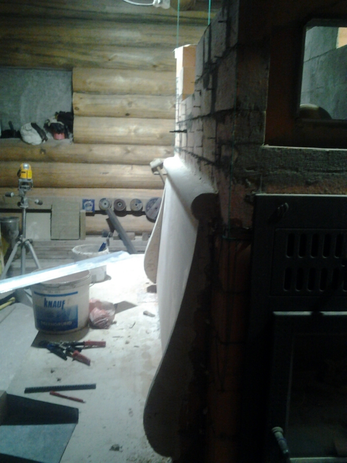 Оштукатуриваем Ротбандом с ПВА и добавлением фиброволокна.Сразу оговорюсь, что в дискуссию о применении " непечной" штукатурки, вступать не буду, так как она не имеет смысла. Первый камин оштукатуренный мной таким образом , даже без фиброволокна, стоит без единй трещины уже 18 лет. Вставляем маяки