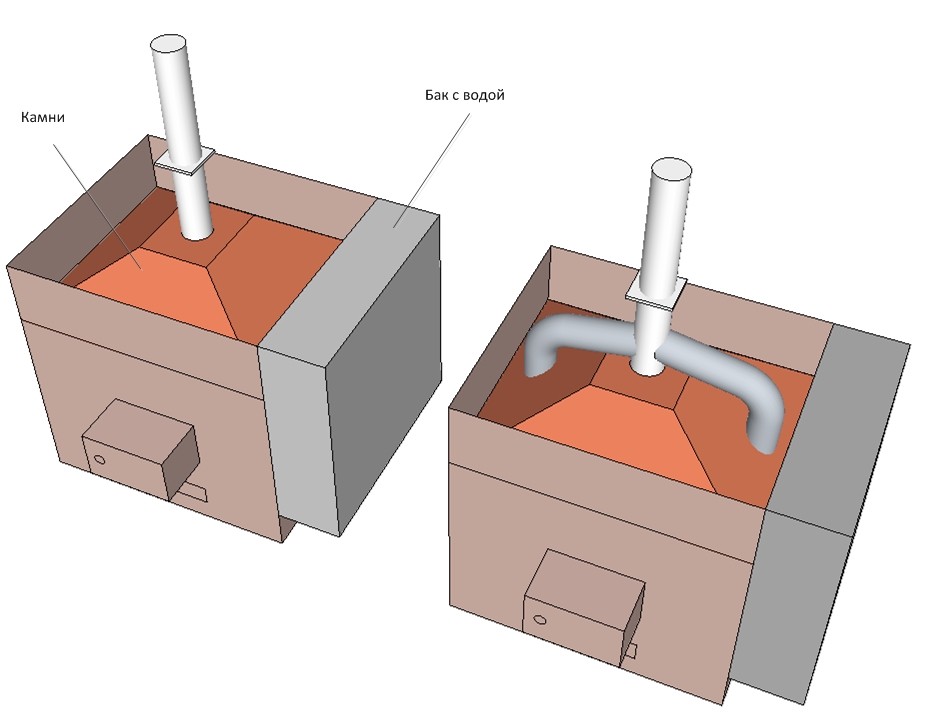 Всем привет. Полгода как построил баню, и чувствую что печку сварили не совсем правильно. Если приварить два отвода как на рис. будет ли толк? И долго греется вода, есть ли какой нибудь простой вариант исправить данную проблему. (рис. слева состояние печки в данный момент)