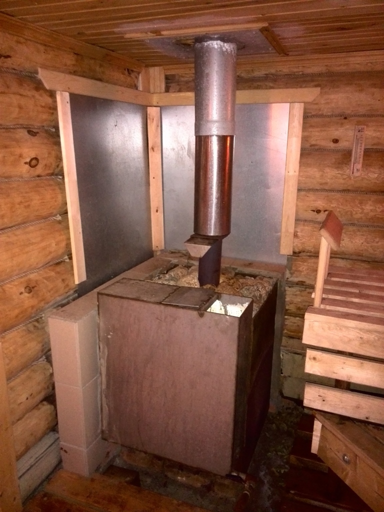 Внутри топки одну стенку(напротив вод.бака) можно заложить кирпичем плашмя, без раствора, заднюю стенку-кирпичем на ребро,тоже без раствора. Сварочные работы -как я нарисовал на вашем рисунке по схеме. Труба после поворотов должна выйти в тот же проем в потолке. Стенку из кирпича можно по высоте продолжить до потолка. Под магазинный ППР обычно подкладываю больший по размеру лист минерита с негорючей подкладкой, что бы закрыть большую площадь деревянного потолка над печкой. Заднюю стенку приварить из арматуры сетку или сплошным ящиком из жел. 2-3мм и заложить вовнутрь камнями, для увеличения теплоемкости. Оцинковку в бане нигде не ставлю, лучше нержавейку.