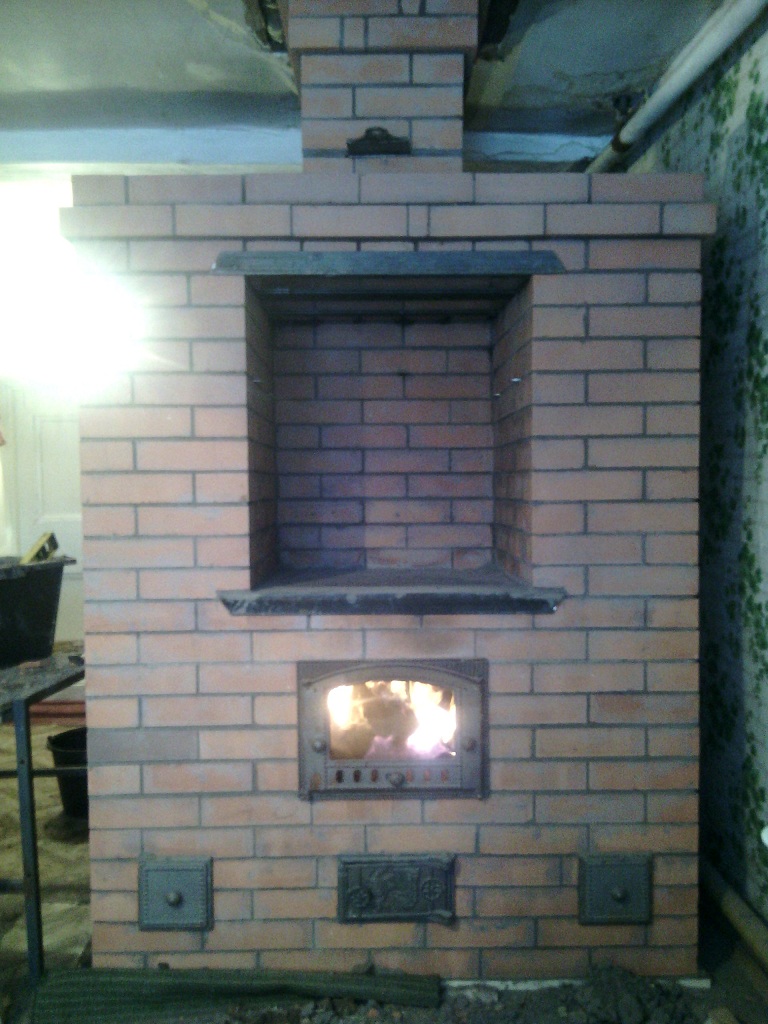 Топочная дверка сделана на уровне с топкой по желанию хозяйки она любит готовить на углях (ну как в русской печи)печёт пироги ставит горшки и т.д.Печь греется со всех сторон,Проект в скетчапе выложить пока не могу(не умею пока),