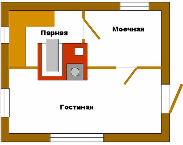 Добрый день дорогие форумчане. На данный момент строю баню из сруба 4,3*6,3 м с комнатой отдыха. мыльной и парной. Сейчас стоит вопрос с выбором печки. На 70% уверен что она будет кирпичной. Выставляю на обсуждение следующую печь. Расположение печи Анатолия Заболотнего в бане для 4-х человек.