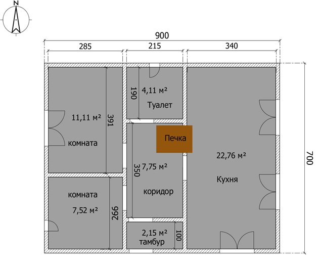 одной печкой в такой планировке не обогреть, на кухню каминопечь, в простенок комнат щиток с топкой
