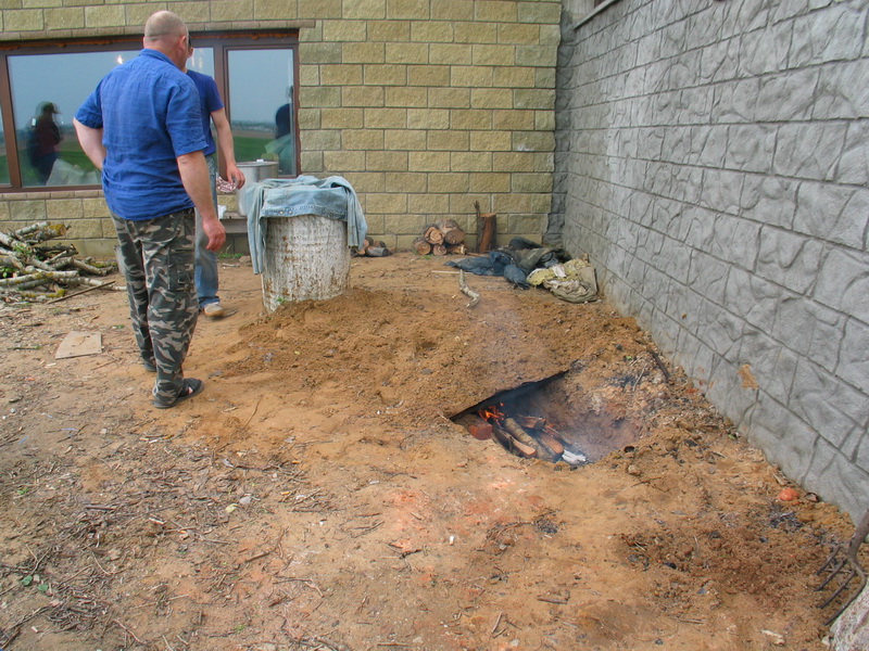На поверхности земли сложена топка из красного неоштукатуренного кирпича. Она представляет из себя бетонную стяжку размером 0,5/0,5 метра. На нее уложены напротив друг друга две кирпичные стенки высотой тоже 0,5 метра. Все в полкирпича толщиной. На первом ряду кирпичной кладки лежит металлическая решетка. На которую кладут охапку дров.