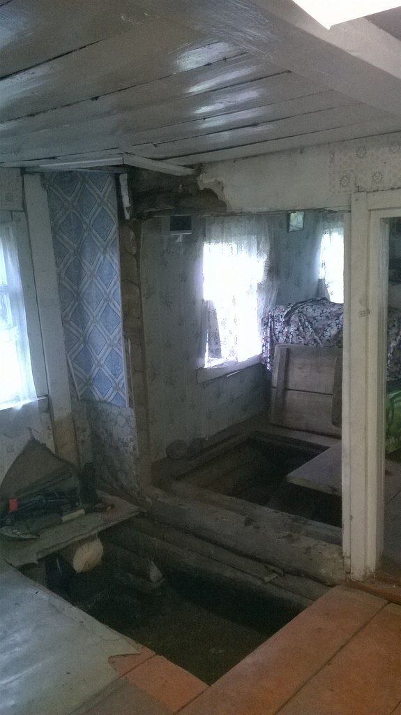 Там ещё западня виднеется, погреб рядом, видимо... Заглубить фундамент ниже подполья, нижнюю колоду оставить, и выкладывать печку на двух опорах. Но следом вопросы с трубой возникают, где и как её выводить... Sad