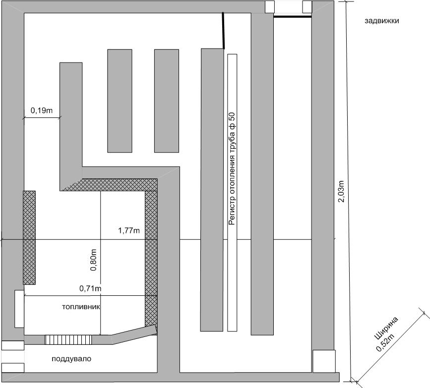 Планируется ПМЖ . Прорисовал более подробно в масштабе второй вариант . За основу взял типовую печь ПТОУ-2500 из книги Школьникова и растянул ее до 170 см в длину .