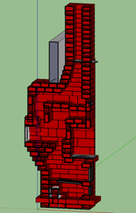 Дом состоит из ж/б панелей (см. рис выше). Печь хотел поставить в углу меньшей комнаты, т.к. это будет спальня и будет утепляться. Но читая форумы пришёл к выводу, что желательно поставить посередине дома, так более рационально и экономично. Поэтому решил вырезать проём в панельной перегородке, залить небольшой фундамент связанный с фундаментом перегородки и туда поставить небольшую печь. Пишут, что фундамент печи должен быть развязан от общего фундамента, но как сделать по другому не знаю. Может быть печь поднять над фундаментом с помощью шанцев? Основную массу печи планировал в большей комнате, там же дверца топки и труба. Это будет кухня, поэтому решил установить плиту. Ещё и потому, что металлическая плита будет быстрее отдавать тепло. В спальню решил выдвинуть одну сторону печи. Чтобы увеличить нагревающую поверхность сделал ступеньками, это позволило не сильно увеличивать общую массу печки. Поставил дверку со стеклом, т.к. через стекло говорят идут большие теплопотери, что опять таки позволит быстрее прогреть комнату. Если при этом получиться ХК хорошо, если нет не страшно. Возможно получиться типа камина под стеклом. Для этого наверно придётся футеровать камеру немного. Проект для соседки смотрю, но это слишком большая печь, я хотел поменьше. В теме этого проекта есть такое высказывание