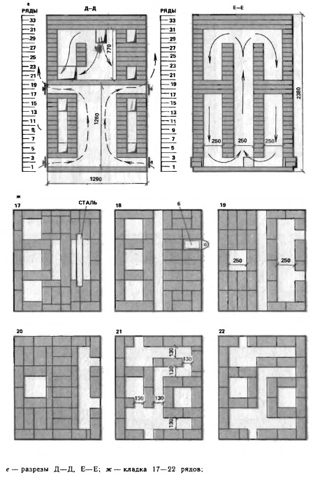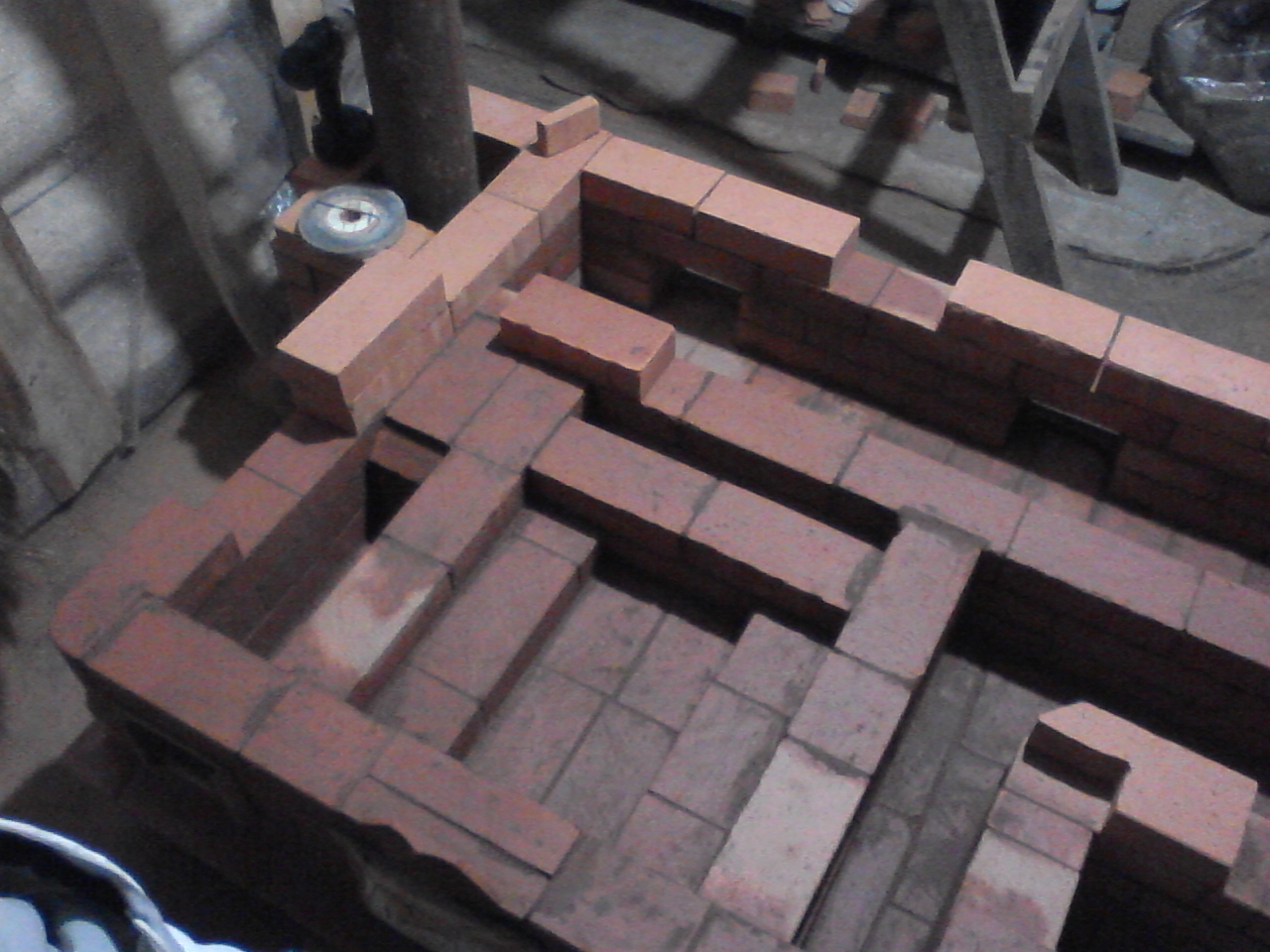 За основу проэкта выбрана отопительно-варочная печь 6,5-7 кВт автора Порфирьева порядовка на основаремонта ру, Из принципиальных различий: вместо варочной плиты - ХК, перекрытая красным Витебским кирпичем, увеличение размеров топки за счет увеличения размеров печи до 5х5 и сужения подъемного канала наружного воздуха до четверти кирпича(фото), футеровка только топки шамотным на ребро с зазором ддя подачи вторички (взамен представленных на видео вмурованных в кладку белых кирпичиков )))), и пристройка лежанки к правому опускному каналу с заделкой с правой стороны основного проэктного выхода газов.