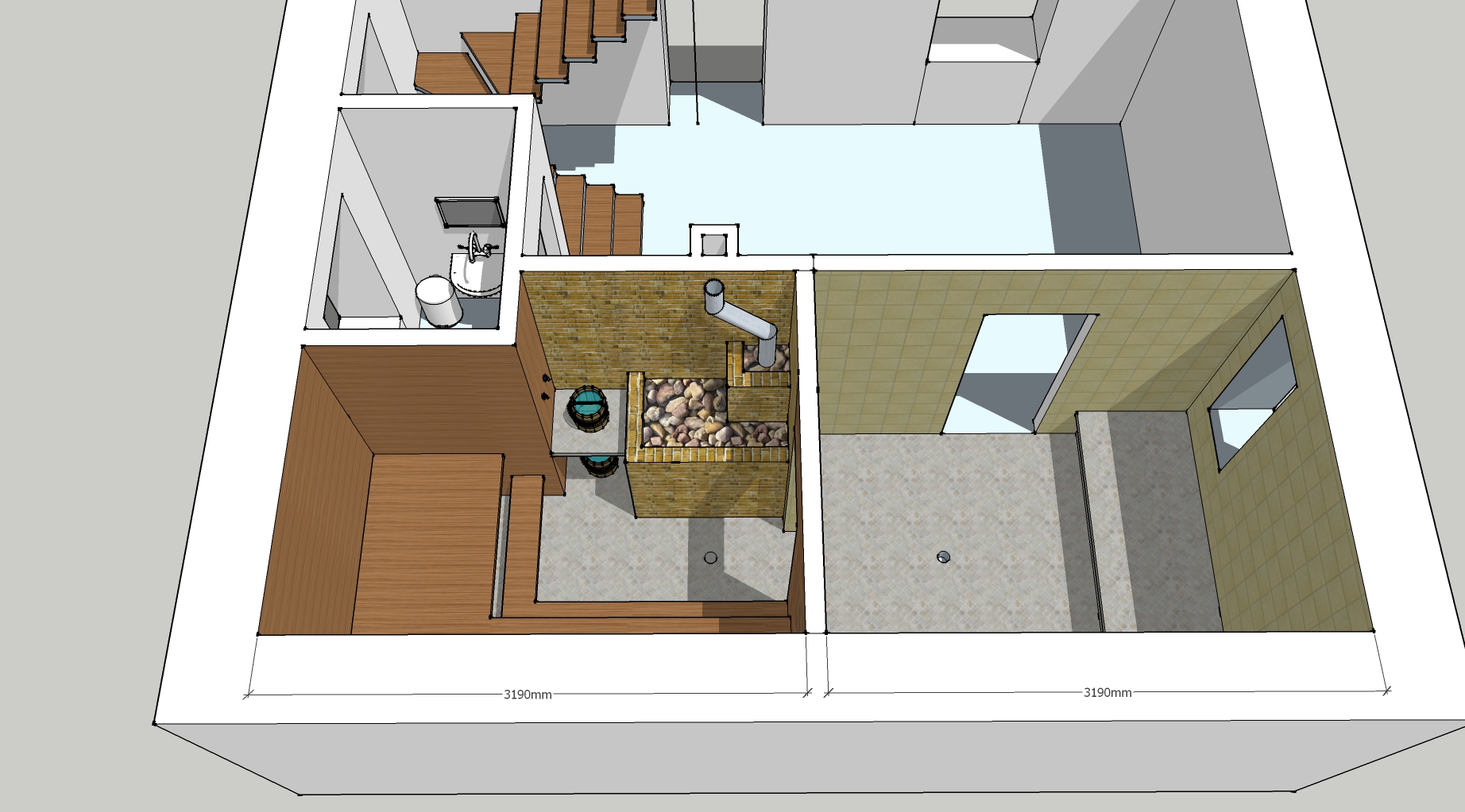 Идея в том чтобы печь как центральное ядро, выполняла свою функцию в парной (открытая каменка), грела мойку и комнату отдыха. Топку производить необходимо из комнаты отдыха. Прекрасно понимаю что при прочих равных комната отдыха сильно греться не будет.