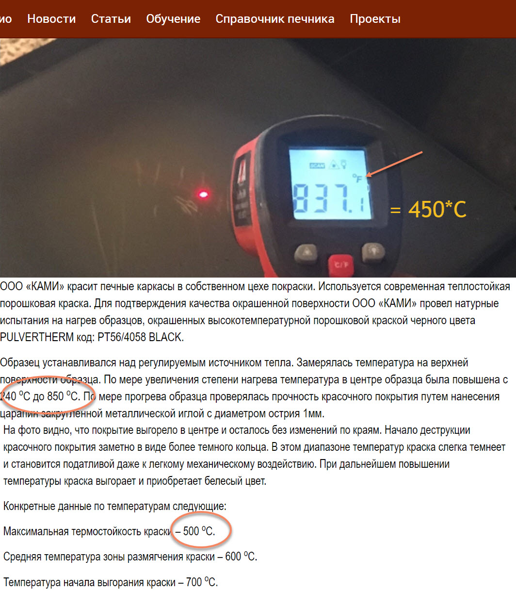 Измерения температуры на пирометре выводятся по шкале Фаренгейта, а выводы в статье делаются по Цельсию, без учета коэффициента отражения ИК луча от измеряемой плоскости предмета с учетом его цвета, шероховатости и пр. Как можно нагреть предмет до 850*С на конфорке стеклокерамической плиты, если последняя максимально разогревается до 600*С? У любителей испытать и не такое бывает ...