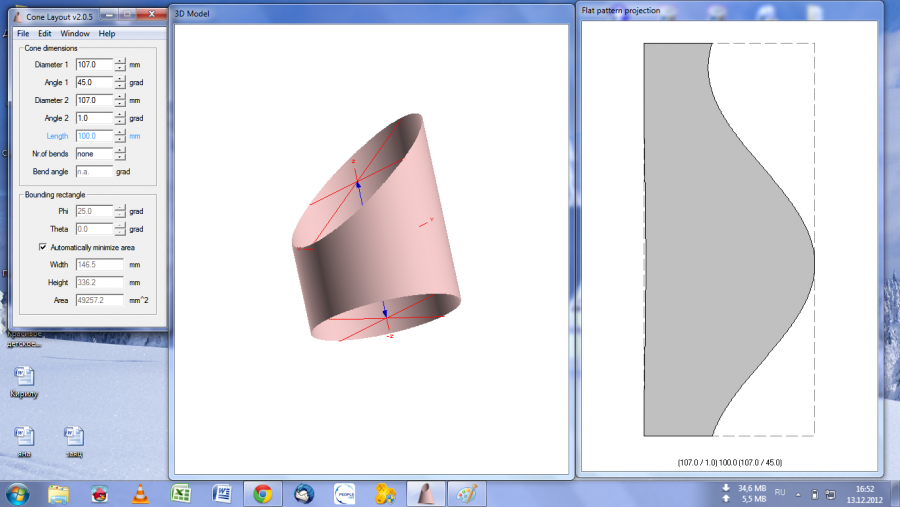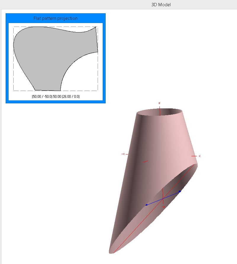 Спасибо за труды, Евгений! Но, нужна именно выкройка усеченного конуса и эллипса пересеченной плоскости. Что-то типа