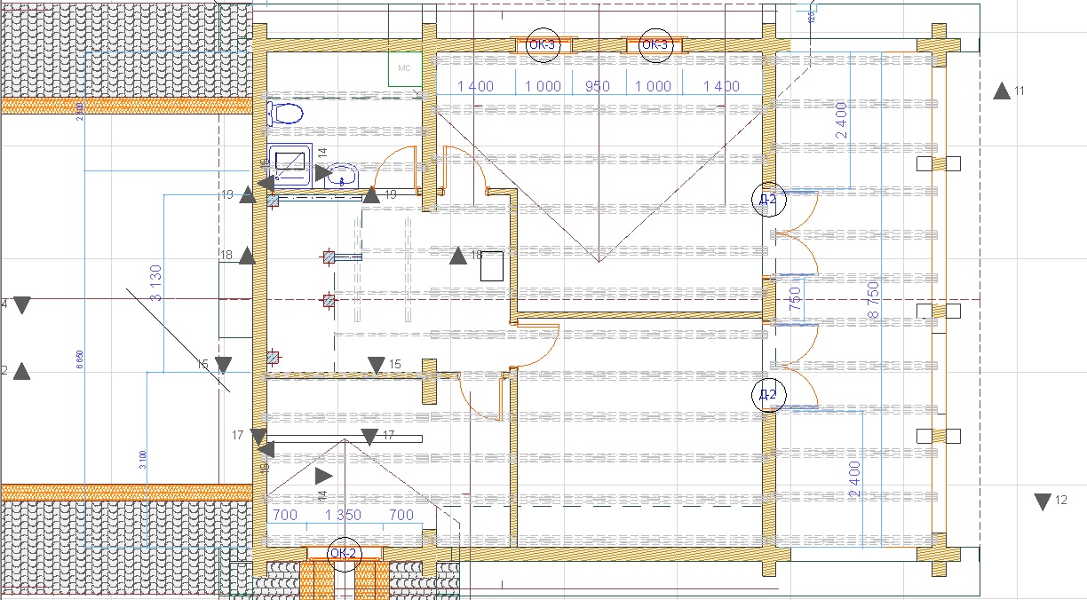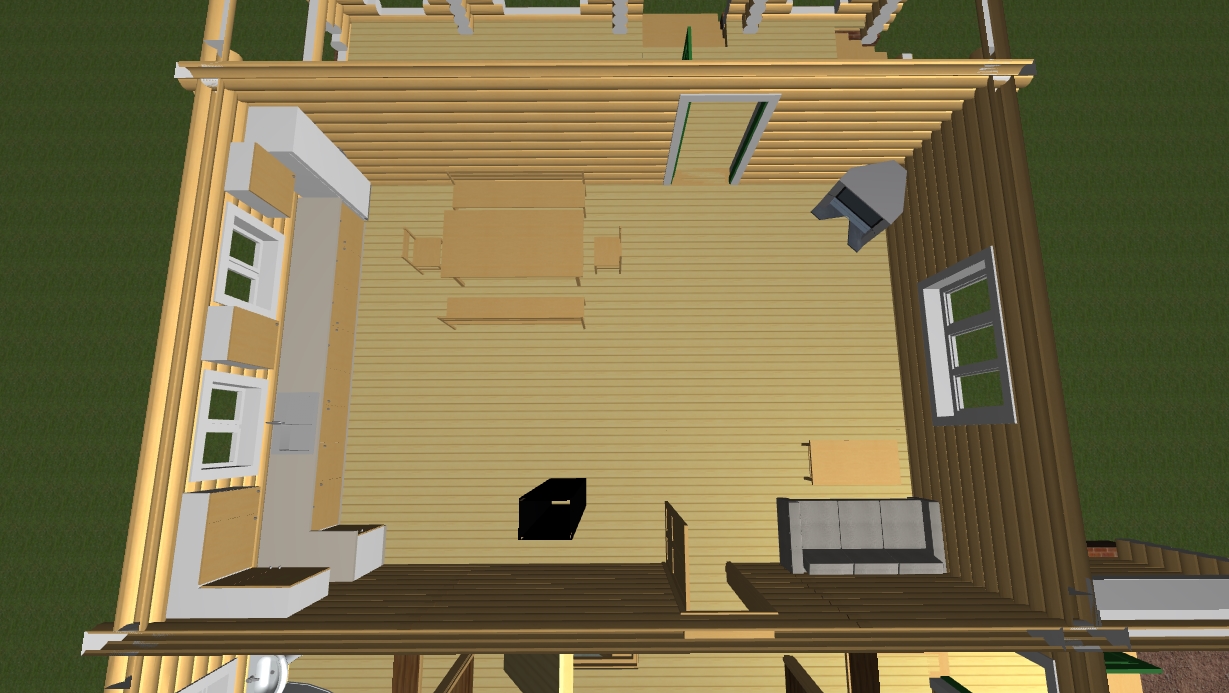Андрей, добрый день! Земляк! Это кухня-столовая-гостинная без перегородок площадью 50 кв.м. - 6*9 по осям сруб. Сверху спальни над этим помещением. Черным цветом обозначено местоположение отверстия под трубу на крыше. Проживание планируется в дальнейшем постоянное. Фундамента пока нет.