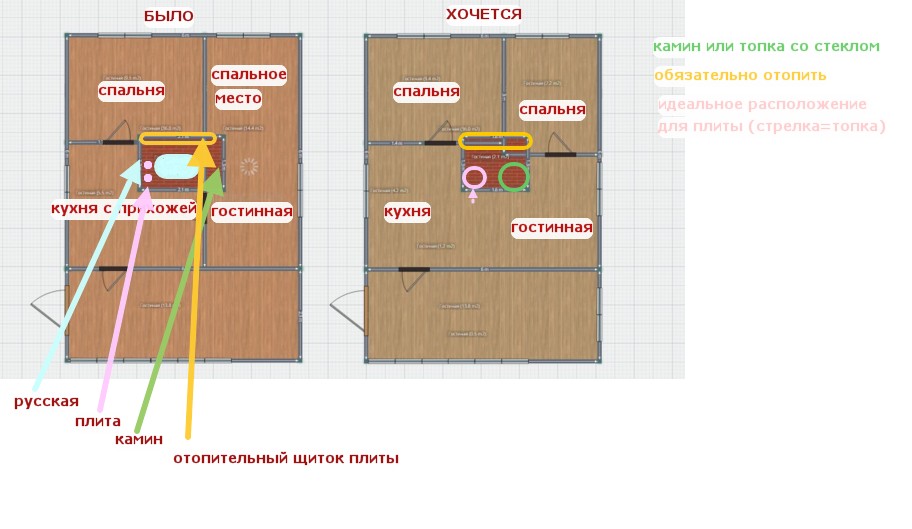 на угловатости зациклилась что бы убрать камин с торца и сделать возможным возведение перегородки. На данный момент в правой комнате расположено мое и гостевое спальное место, что не очень удобно.