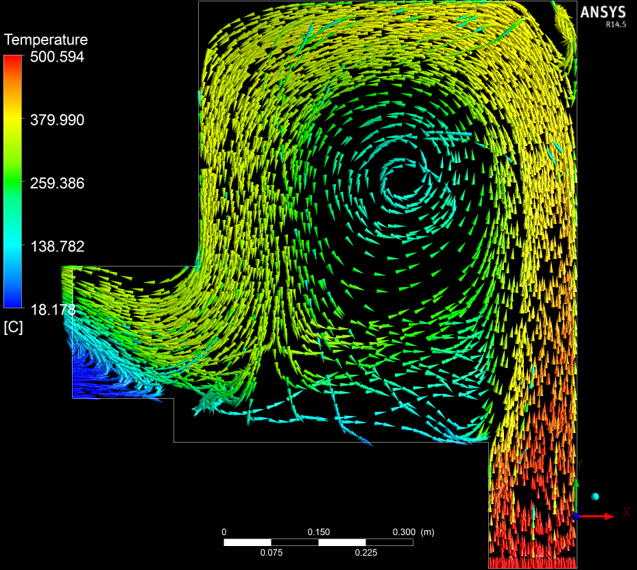 Дальнейший процесс я вижу так: Жёлтые линии по мере нагрева тепловоспринимающих поверхностей колпака будут опускаться вниз до дна колпака.Место жёлтых линий будет занято ярко жёлтыми линиями -которые будут крутиться по кругу и не пускать жёлтые линии вверх. Это будет сигнализировать от том - что дальнейшая протопка печи бесмысленна. Будет "перетоп",перегрев массива колпака, повышения температуры отходящих дымовых газов.Как смоделировать дальнейший процесс?