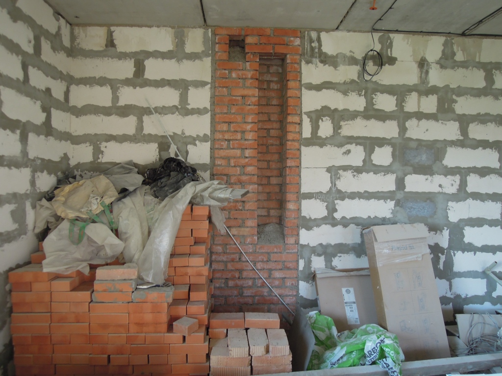Ситуация такова. Заканчиваю кладку камина (ФОТО 5), осталась нутрянка 27-го и 28-й ряд. Труба встроена в стену (ФОТО 1). Сечение трубы где-то 265*160 (если добавить к ней стенку в пол-кирпича спереди). Таков же размер шибера. На 23-24 рядах сделан выход из дымосборника в трубу (ФОТО 4 и 6), на 25-м этот выход частично перекрыт напуском целого кирпича на 6 см с каждой стороны и на 26-м ряду перекрыт полностью (ФОТО 4). На этом же ряду сделан напуск целыми кирпичами на пол-кирпича в трубу, чтобы образовать переднюю стенку трубы (ФОТО 2 и 3). Последующими 2-мя рядами планирую продолжать кладку передней стенки в пол-кирпича ложками (ФОТО 7). Соответственно, напуски для образования передней стенки трубы на 26-м ряду, прижмутся 27-м и 28-м рядом. (надеюсь, внятно объяснил. просто, испытываю проблемы с терминологией, не понимаю, как объяснить). Далее – ВСЁ, камин окончен. Остаётся только продолжить кладку передней стенки трубы до места, где она перекрывается передней стенкой, висящей на прутах арматуры. Вопрос: вот эта передняя стенка, которую я планирую выложить уже над камином (и без перевязки, заметьте), не опрокинется ли вовнутрь камина? Т.е., хватит ли опоры в 3 ряда для того, чтобы удержать эту стенку от опрокидывания (ну, я имею в виду не столько прям таки прямое опрокидывание, сколько давление на стенку трубы, которое может привести к растрескиванию швов)? Если да, то что посоветуете, как выйти из данной ситуации? Может, выбить бетон из швов, вставить туда арматуру и выложить стенку трубы уже опирая её на эти пруты? И, ещё: на каком растворе эту самую стенку выкладывать: на печном, как и сам камин? или на бетонном, как и сама труба?