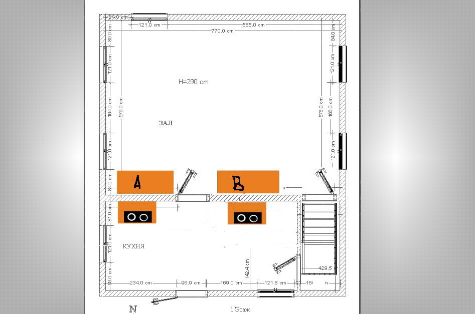 В двух словах. Печь камин устанавливается у стены противоположной стене у которой проедложил расположить печи Валерий Петров вариант "В". Булерьян устанавливается вместо варочной печи вариант "В".