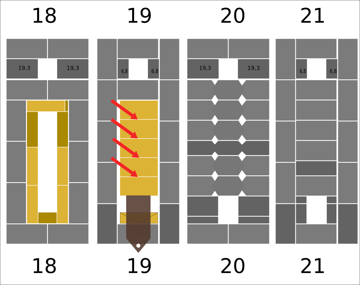 Возникает вопрос заполнять ли глиной (мертелем в случае огнеупорного кирпича) зазоры между кирпичами в перекрыше (пометил красными стрелками на скриншотах)? Ведь глина высохнет и вывалится вниз (перекрытие здесь не сводчастое и не клинообразное. Или не делать швов и класть кирпичи впритык? Как я понял кирпич в основном расширятся будет в длину, а не в ширину.
