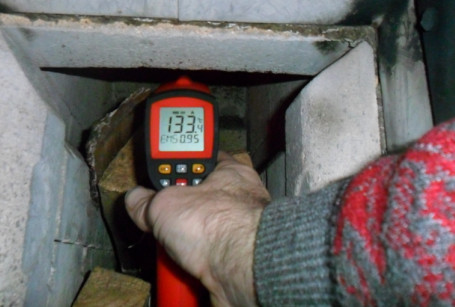 Режим устоявшейся печи после топки через 6 часов. В помещение плюс 25*С. Измерялась температура поверхности внутренней и внешней стенки печи в районе центра ХК со стороны задней стенки печи. Печь топится утром и вечером, последняя топка - 10 кг дров (70% мокрых )