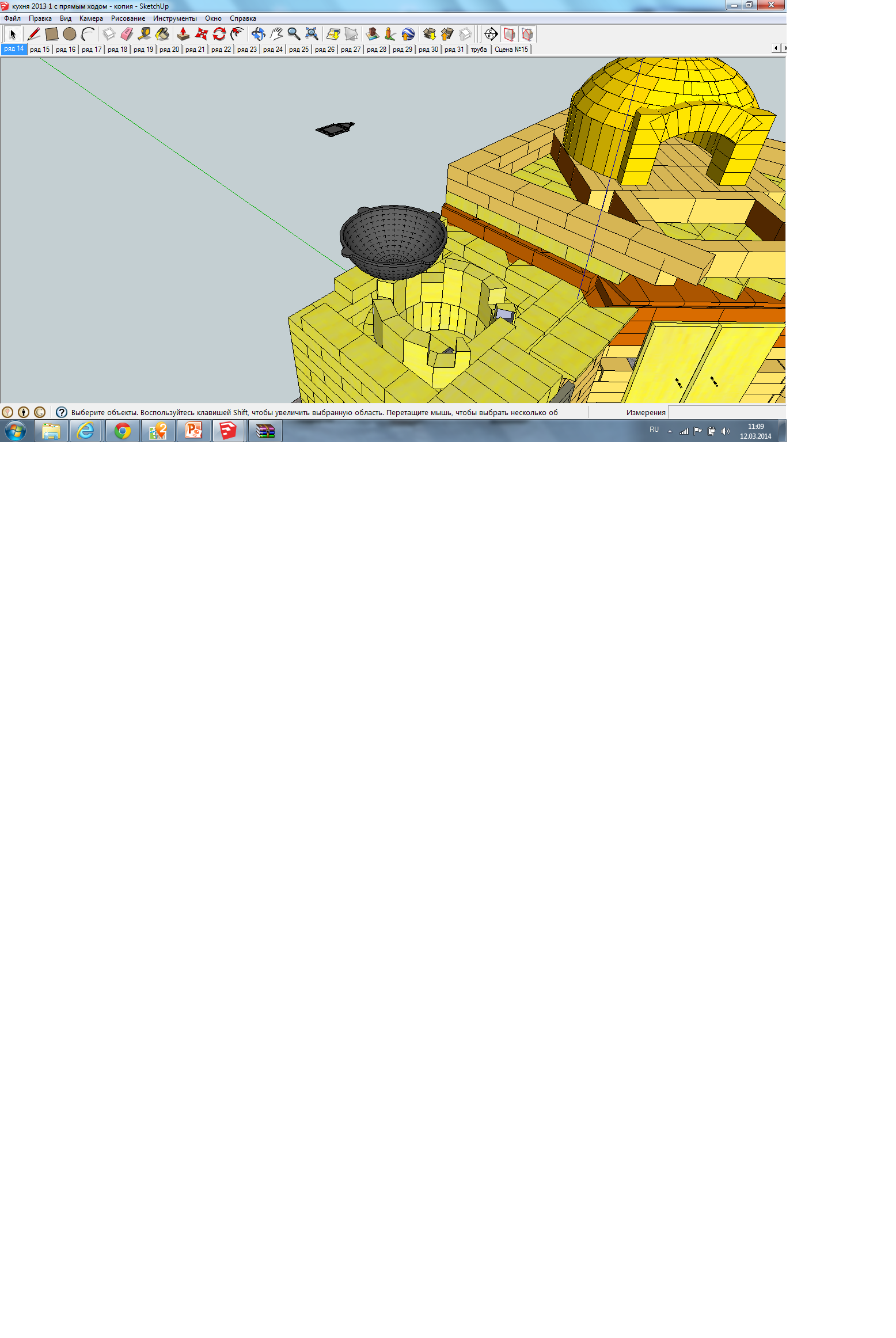 В Скетчупе я решил делать размеры с учётом швов печного: 256х128х70 мм, шамотного Ш-8: 252х126х67. Это позволяет не забивать голову лишними проблемами во время проектирования и довольно близко к реальности.