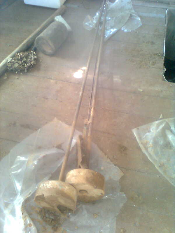 По фото сварил два бура, один просто чашка с резцами, второй чашка с откидной лопаткой. Но высокий уровень воды не позволял начать бурить, там прослой песка, пришлось ждать.