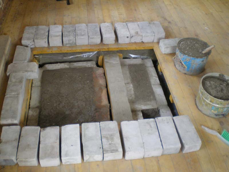 Если пол деревянный - первые 2-ва ряда - дымоходы не устраиваются, лишь поддувало во втором ряду.