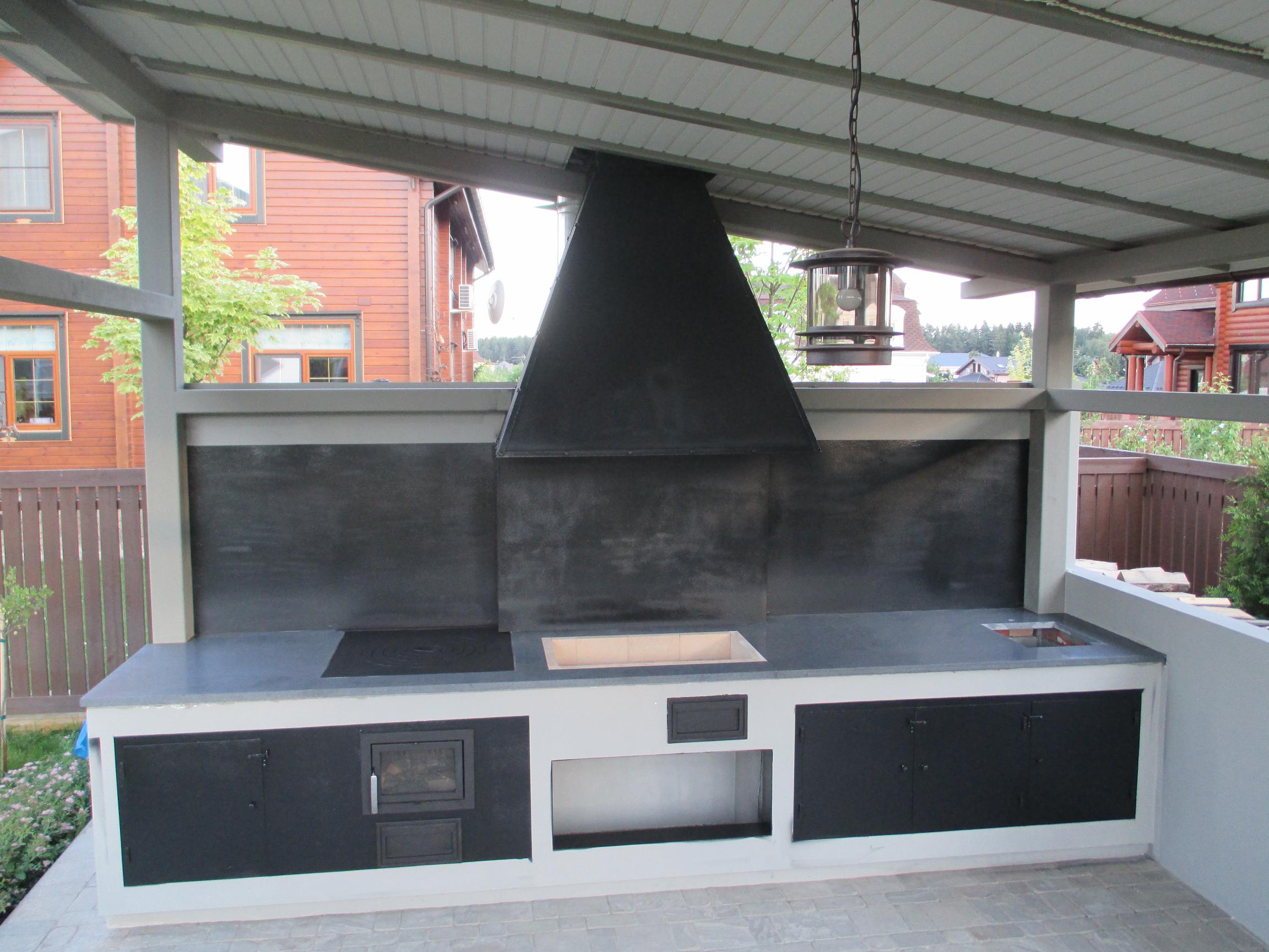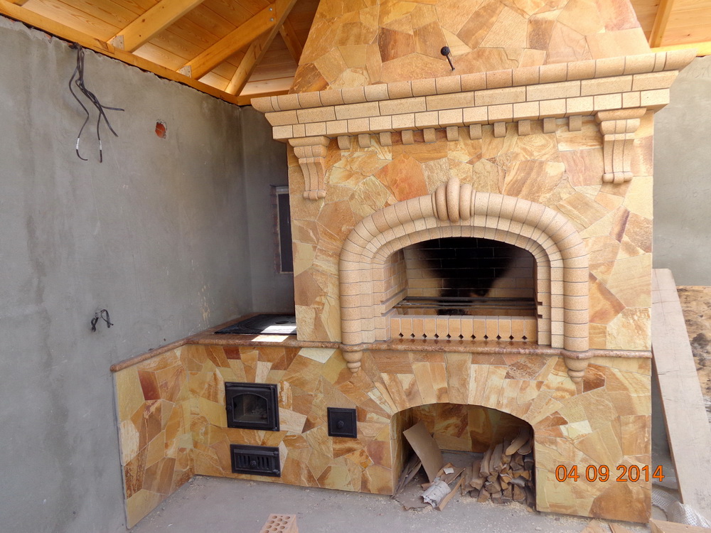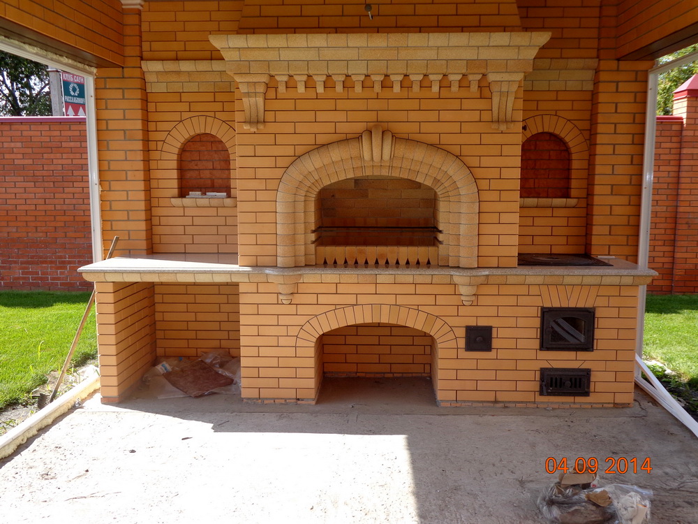 Наше с напарником Игорем барбекю! Сделать пониже портал барбекю не удалось, заказчик заказал дверцу со стеклом пришлось идти на поводу! Честно перед началом работы предупредили что может дымить (ширина 90 высота 85 см). В итоге поигрались с дымосборником и трубой, и кажется выиграли при сдаче все работает отлично. Состав комплекса слева направо: мойка, разделочный столик, плита встройка на две комфорки, мангал с вертелом (под барана), казан (не дровянной, встраивали газовую форсунку, кочегарит будь здоров), разделочный столик.