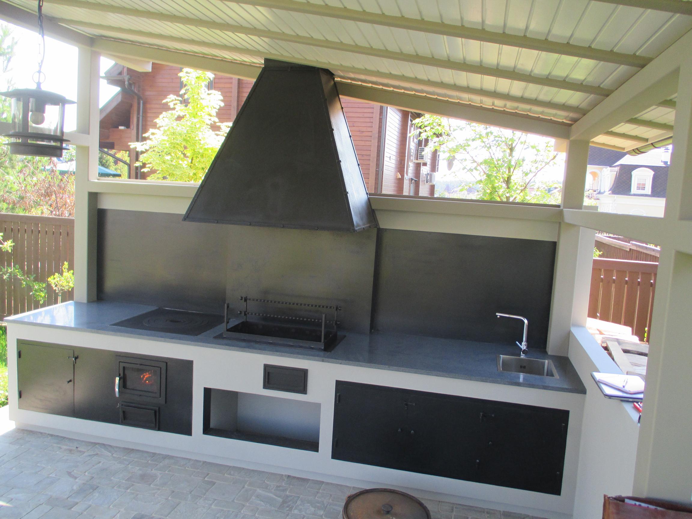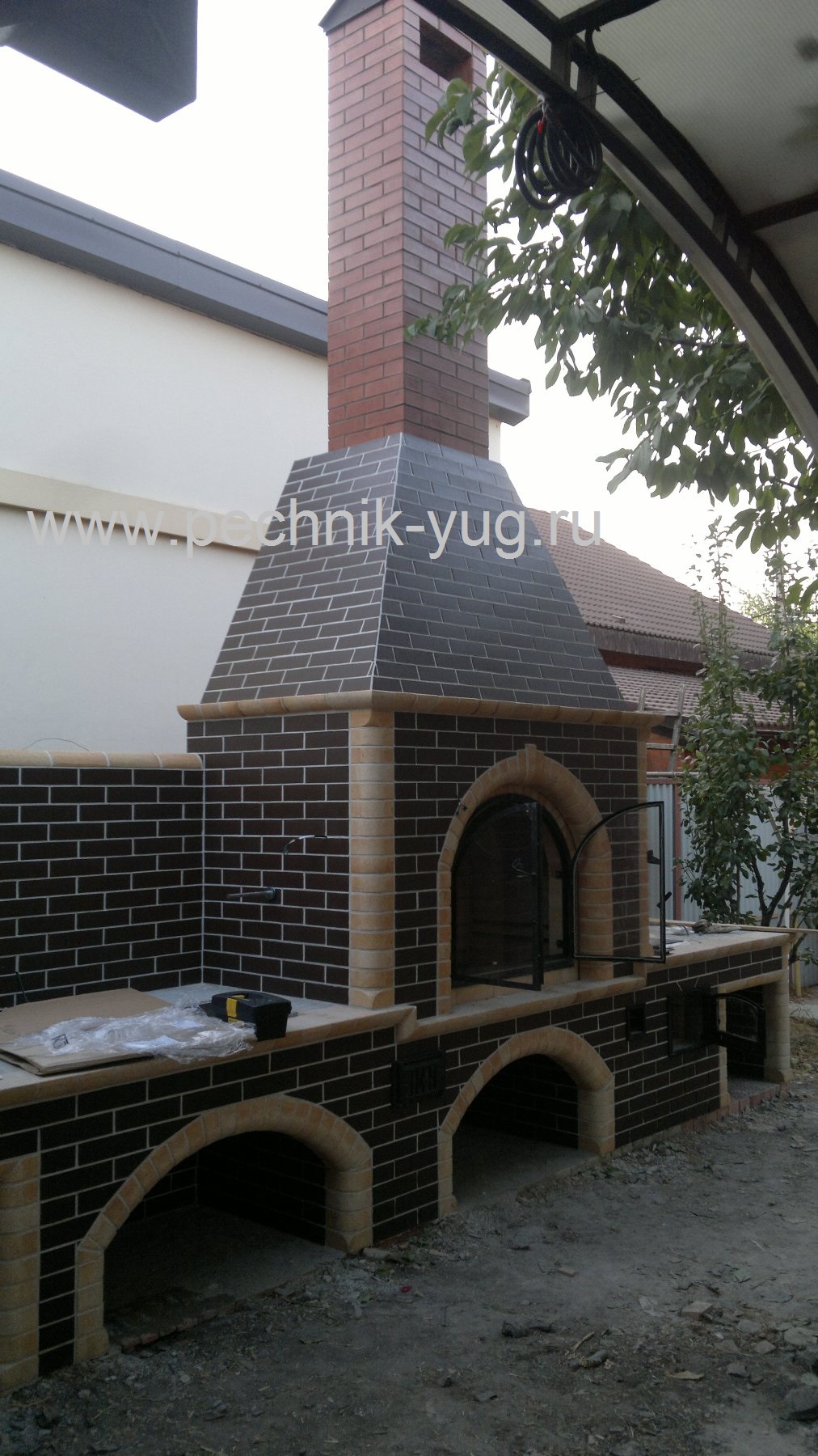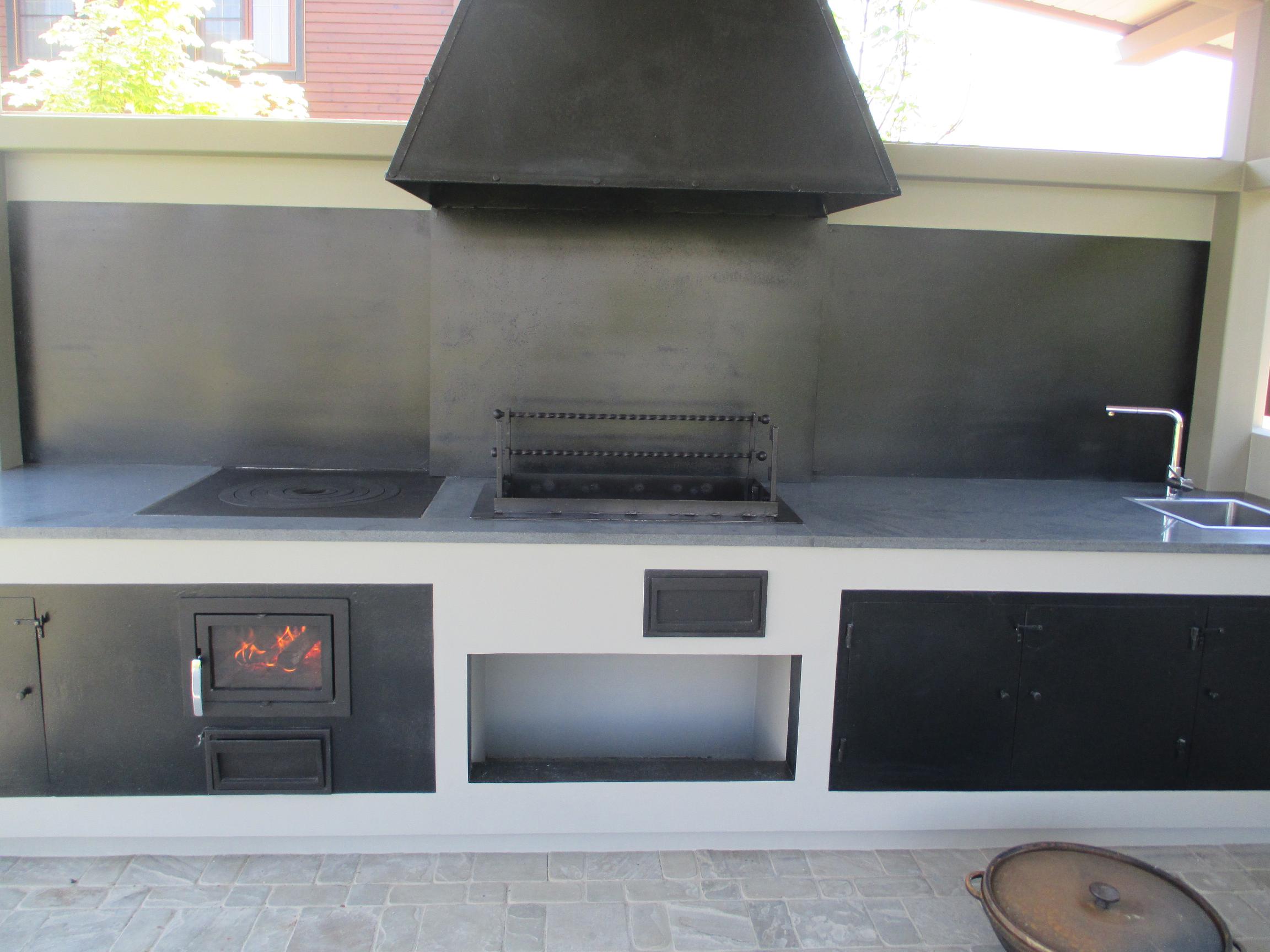 Наше с напарником Игорем барбекю! Сделать пониже портал барбекю не удалось, заказчик заказал дверцу со стеклом пришлось идти на поводу! Честно перед началом работы предупредили что может дымить (ширина 90 высота 85 см). В итоге поигрались с дымосборником и трубой, и кажется выиграли при сдаче все работает отлично. Состав комплекса слева направо: мойка, разделочный столик, плита встройка на две комфорки, мангал с вертелом (под барана), казан (не дровянной, встраивали газовую форсунку, кочегарит будь здоров), разделочный столик.
