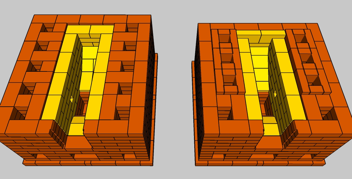 Оба варианта, благодаря объёму внутреннего массива, имеют повышенную теплоёмкость, но первый вариант больше тепла аккумулирует внутри, а второй равномернее внутри и в наружных стенках.