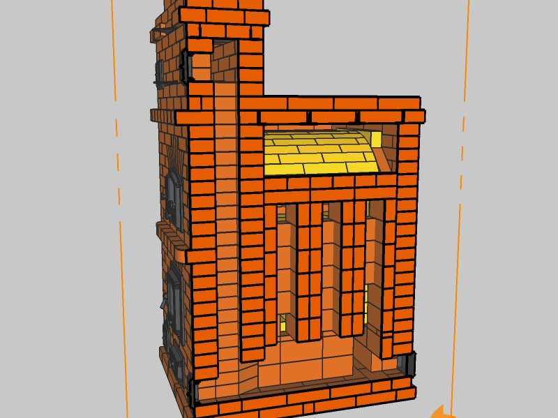 Поскольку дом будет использоваться как дача, а печь сильно теплоёмкая, придётся долго ждать, когда печь выйдет на режим, начнёт отдавать тепло и прогреет комнаты. В гостиной это решается топкой буржуйки, а в спальне, которая сзади, буржуйки нет. Вот тут и может выручить задняя дверка. После полного прогорания углей и закрытия задвижки можно в спальне открыть эту дверку и нижние прочистки. Тепло изнутри печки интенсивно пойдёт наружу, по принципу, как в банной каменке, и спальня прогреется быстро. Свод горнила при этом не остынет. На всякий случай, чтобы не попахивало дымком, перед этим можно проветрить печь через ЗЛХ.