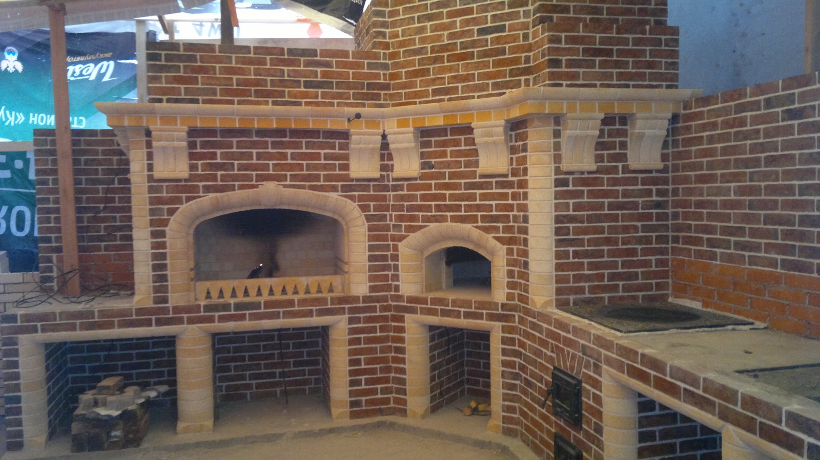 В копилку форума, печной комплекс из бельгийского кирпича ручной формовки. Состав комплекса слева направо: разделочный столик, мангал 1 метр, помпейская печь, казан, разделочный столик, мойка. Размеры комплекса 4*4 метра, все сведено в одну трубу девятерик.