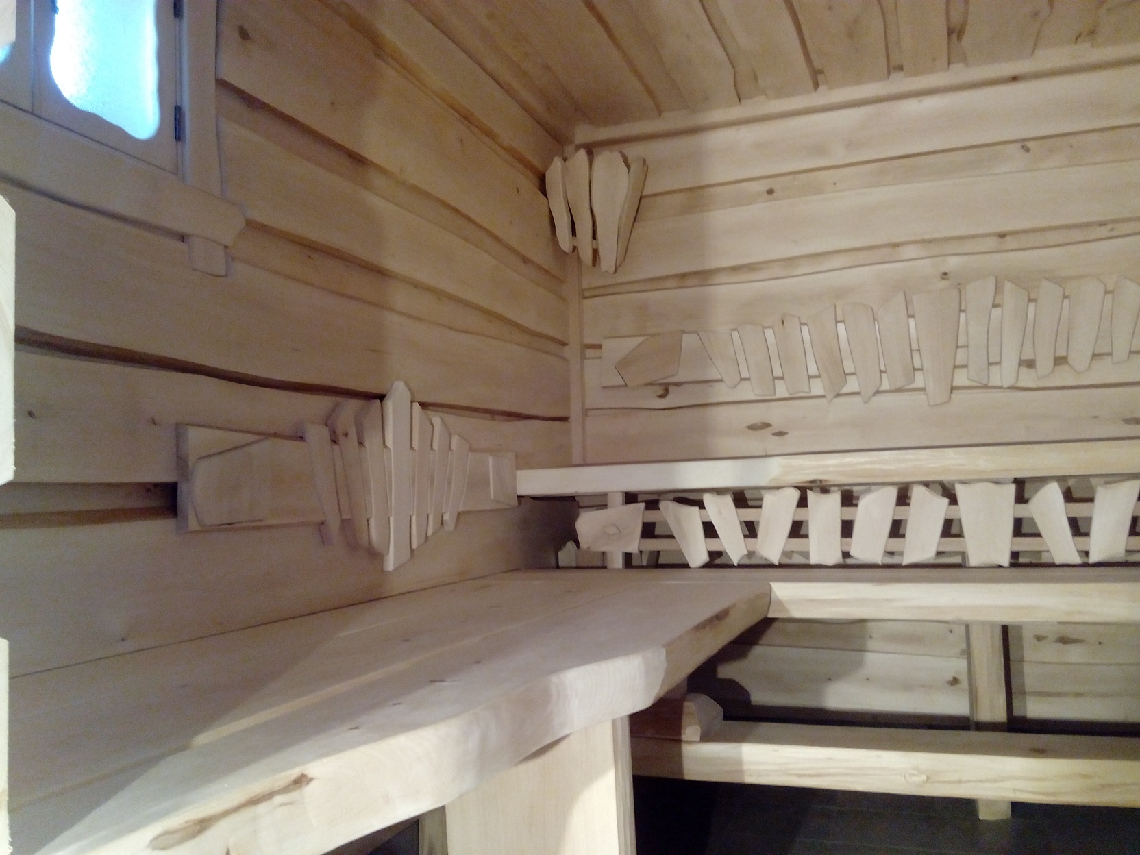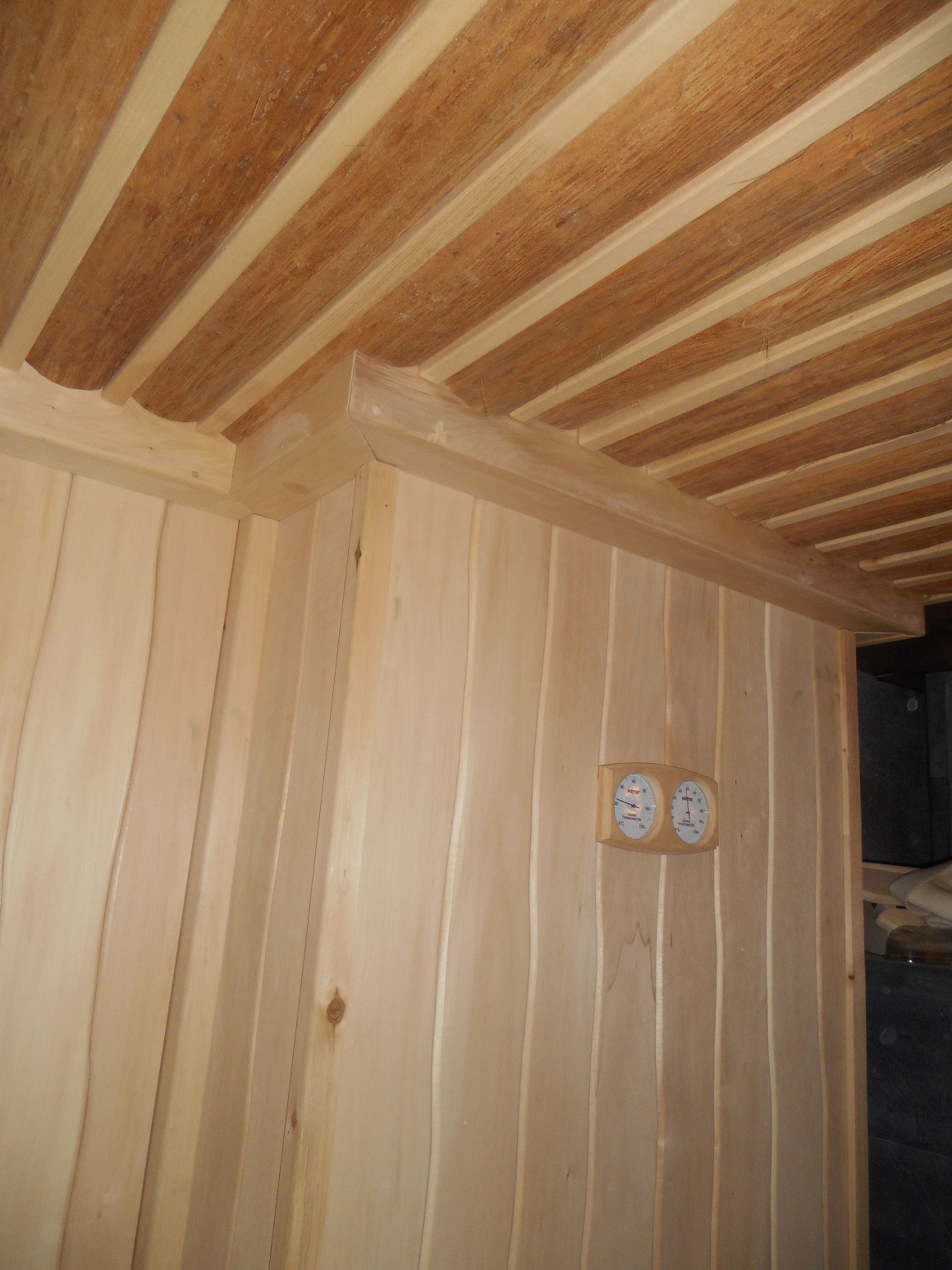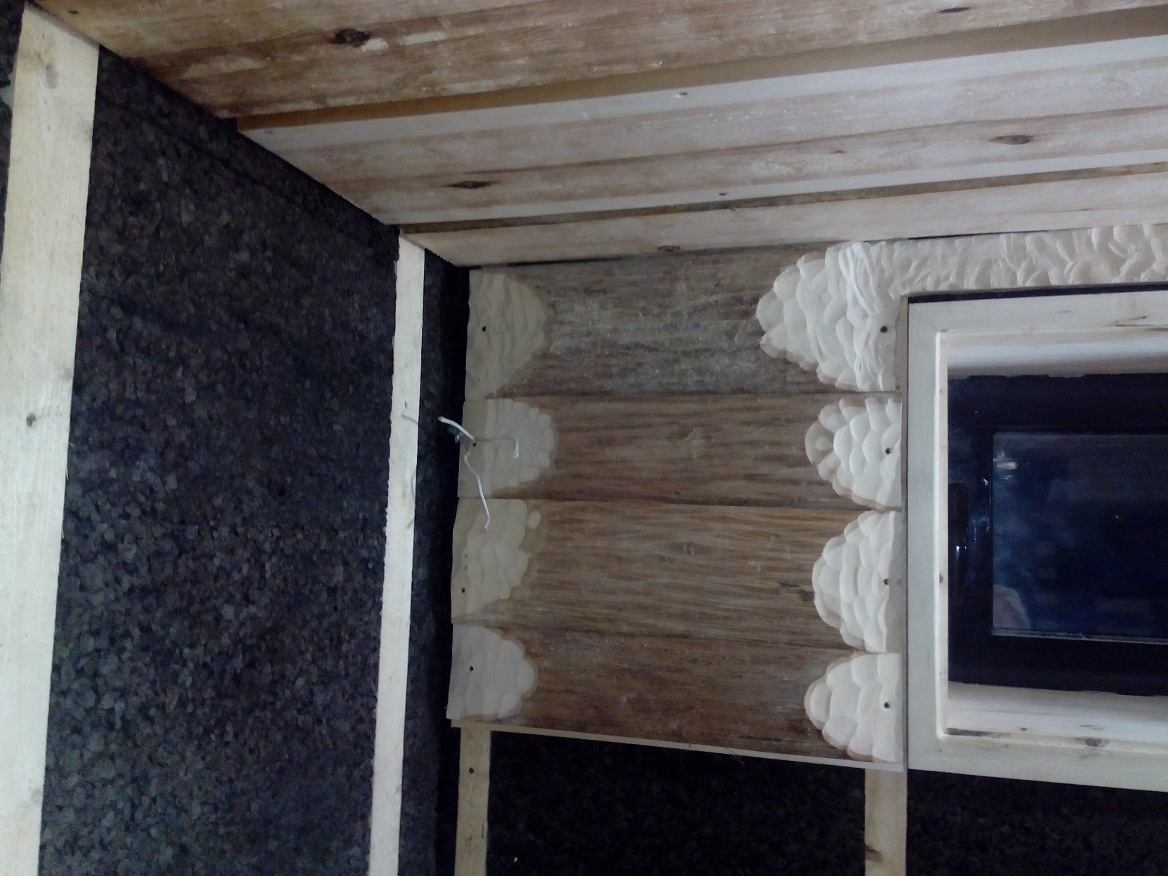 А для отделки этой парной использовал тесненную липовую доску и полубревно липа с чЁсом(лыко). Ну и пробкавая капсула в качестве утепления и пароизоляции.