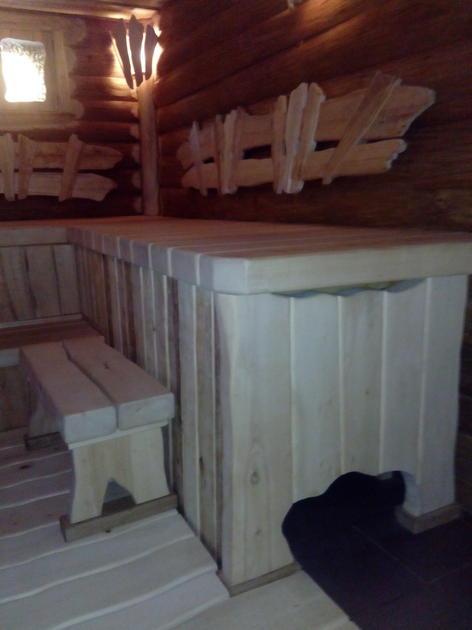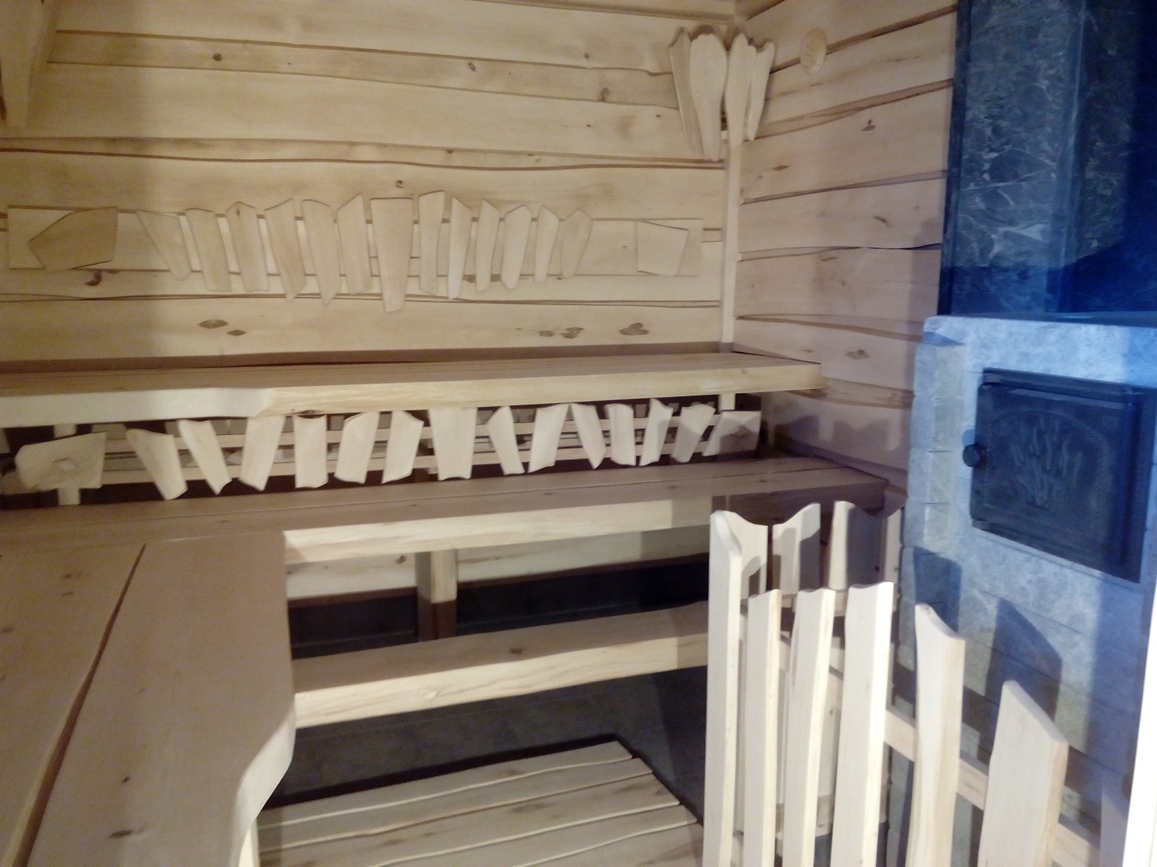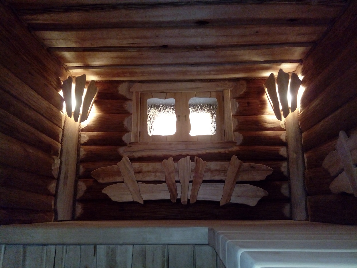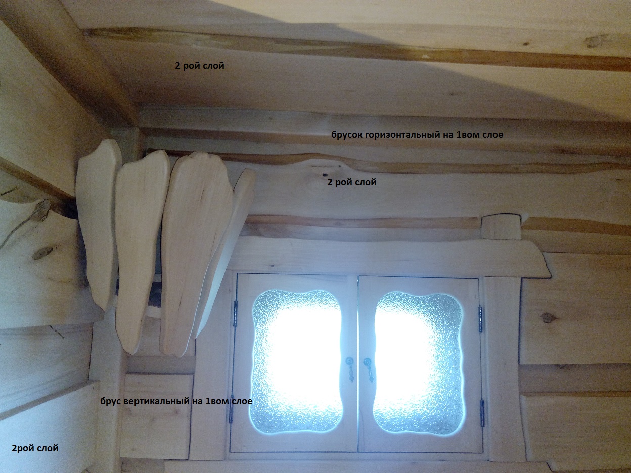 А для отделки этой парной использовал тесненную липовую доску и полубревно липа с чЁсом(лыко). Ну и пробкавая капсула в качестве утепления и пароизоляции.