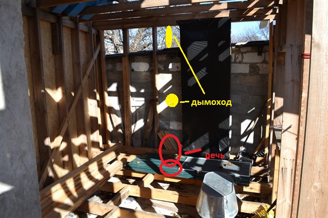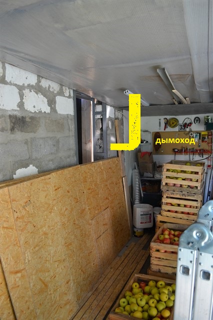 Это будет мастерская. Через гараж хочу вывести трубу из двух соображений: остаточным теплом подтапливать гараж и избежать прохода трубы через сгораемые конструкции мастерской. Между гаражом и мастерской планирую поставить дверь. Фундамент под печь уже залил, поэтому место только это.