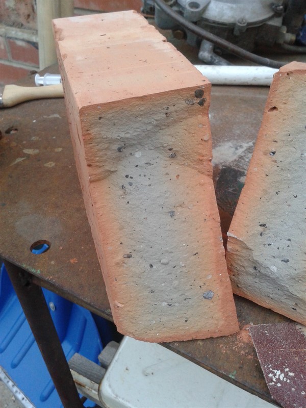 После двух часов в огне и примерно двух часов остывания в прогоревшей буржуйке начал доставать кирпичи. Оба распались на половинки при вынимании. Потом кидал половинки на землю с высоты 50 см, они кололись на мелкие части.