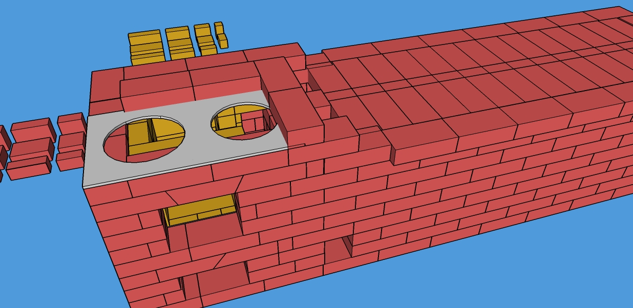 Вы сделали Уже топливник, справа положили шамотный кирпич. Вероятно, он нужен, чтобы в 11 ряду по нему положить красный для формирования канала сзади? По чертежу напротив него на левой шамоной стенке должен быть еще один шамотный, точнее 1/2. На них укладывается вата? Вы убрали кирпич в левой шамотной стенке. Для чего? Относительно сковородок не понял. Меня волнует то, что длина варочного настила такова, что он ложится практически до внутренней поверхности дымового канала, а по чертежу такого не должно быть. Может надо сдвинуть влево всю топочную часть от дымового канала на полкирпича, т.е. удлиннить конструкцию?