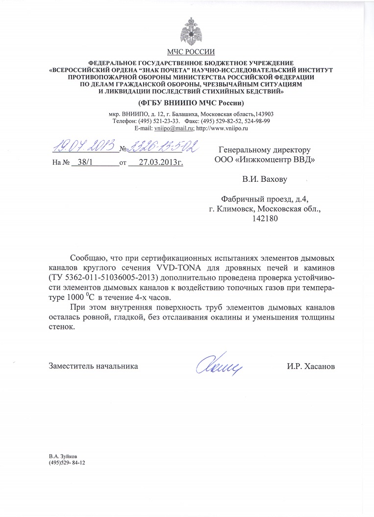 Дымоход прошел дополнительное испытании в МЧС с температурой исходящих газов 1 000 С в течении 4 часов. Вот соответствующая бумага и фото образца прошедшего это испытание. Образец храниться на заводе. Мне любезно разрешили на него посмотреть.