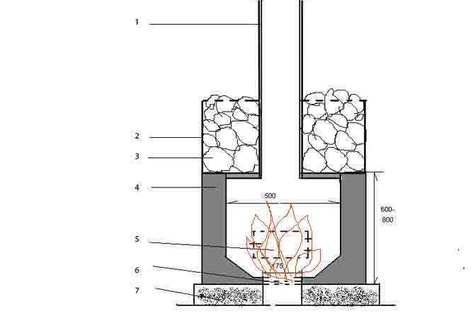 Топливник перекрывается "глухой" стальной плитой, в которую вваривается дымоотводная труба. Пространство между трубой и стенками бочки закладывается камнями.