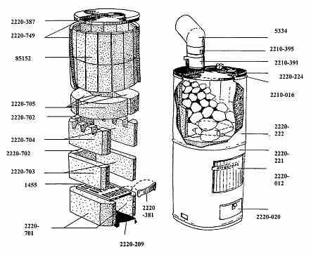 На перекрытие насыпают камни слоем 300 мм, располагая самые крупные внизу. Камни подбирают плотные огнестойкие и с хорошей теплопроводностью (из тёмного перидотита, гранитные или др.), округленные, диаметром 70-150 мм.
