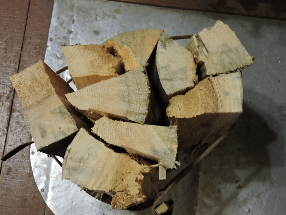 Вот столько дров у меня уходит на две печки за один раз. В ведре 4.9 кг, в связке 6.6 кг. Этого хватает, чтобы нагреть плиту до такого состояния.