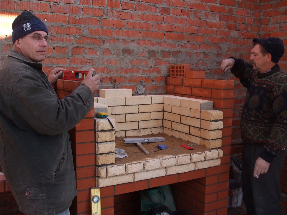Я тоже строю такого же типа несложные мангалы с печками под казан. Вот фото. Можете критиковать. Мангал без зуба. Труба в шестерик с гильзой 250 мм. Кладка облицовочного кирпича не цементно-песчанном растворе. Поэтому топочную дверцу печи под казан креплю на шамотную футеровку. Работаю с подсобником.