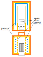 Регистр находится всегда в самой разогретой части горизонтально, свободно омывается теплыми газами и площадь его должна быть больше теплообменника классического котла (т.е. температура газов ниже). Масса кирпича 1000 кг нагретого до 500С запасает столько тепла, сколько 2500 листров кипятка, а по объему занимает гОраздо меньше куба. Т.е. найти места будет легче, Легче занести, чем бак на 2,5 тонны, варить не надо и течи устранять.Еще одним плюсом такой схемы является отсутствие засаживания регистра, т.к. во время топки он изолирован от дыма.