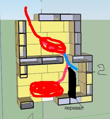 3. Поток из топливника разделяется с помощью прогара и часть газов попадает сразу в щиток, прогрев более менее выравнивается по времени. Способ сложноват конечно, ибо трудно рассчитать размер прогара, для разных случаев.