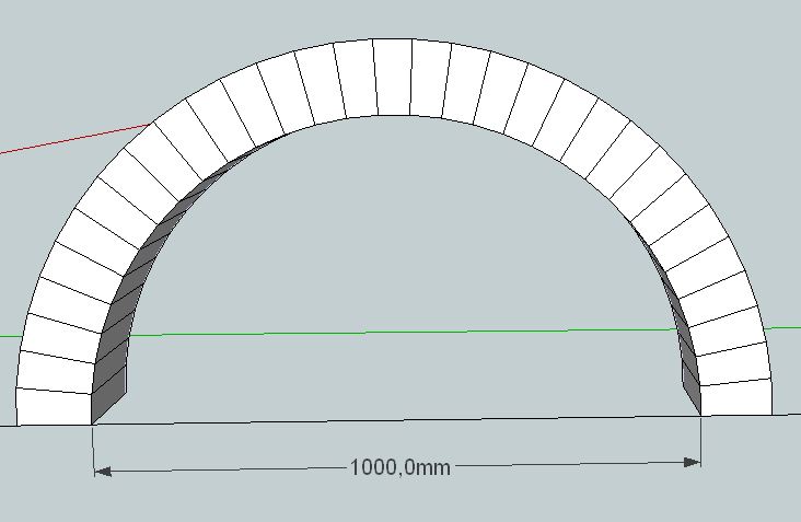 Имел проблемы с прикидкой по арке. Пришлось написать программку для построения арки. Арка строится по "дедовскому" способу, из того что есть, без резки кирпича (можно использовать обычный или стандартный конусный), за счет изменения толщины шва между кирпичами.