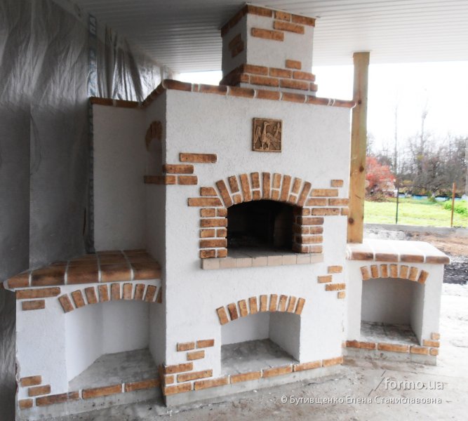 Пришел дизайнер и все испортил развернув печь вдоль стены +добавлен клинкер или камень колотый над арками и какое то керамическое панно . На данный час и день задумка фасада печи такая примеры с инета .