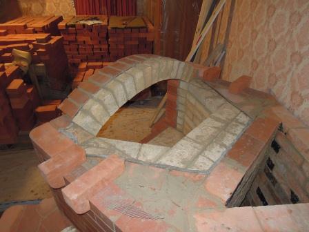 Площадь портала задавал как чуть меньше 2% от площади помещения (28 кв.м. 5х5,6 м, 2,57 м от пола до потолка). Размеры такие: ширина портала 88 см, высота от 49 до 63 см (в зависимости как считать, от пят или от верха арки, при расчёте я брал среднее: 8 рядов, т.е. 56 см). Т.е. соотношение высоты портала к ширине 70%. Глубина топки 44 см, если считать от края задней стенки арки (сама арка, если брать в сумме оба контура - 19,5 см). Т.е. 70% от высоты портала и 50% от ширины. Общая длина пода 2 с четвертью кирпича. Топка трапецевидной формы с сужением к задней стенке, из-за чего задняя стенка 38 см. Просвет между верхом зуба и задней стенкой арки 13 см. Задняя стенка идёт ровно 5 рядов, затем идёт зуб с выдвижением на 4 см на каждом ряду в течение 7 рядов, потом идёт ещё один ряд зуба без выдвижения, а потом дымосборник 14 рядов с постепенным сужением с размера 88х44 см на размер 25х25 см (считал соотношение 1:8 сечение трубы к порталу, но высоту портала считал не по верху арки, а по её середине и при расчёте сечения трубы не учёл толщину пластины 1,5 см поворотной заслонки, не знаю насколько это критично). Потом стоит поворотная заслонка 25х25 см с пластиной толщиной 1,5 см. Затем ещё 2 ряда трубы, затем труба разворачивается вокруг своей оси на 45 градусов, чтобы вывести её параллельно коньку крыши. Затем ещё 12 рядов трубы на чердаке до кровли.